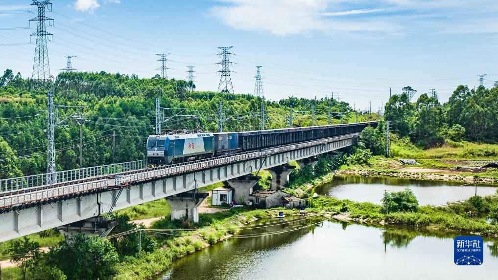 10月2日,满载货物的列车从钦州港东站驶出(无人机照片)。