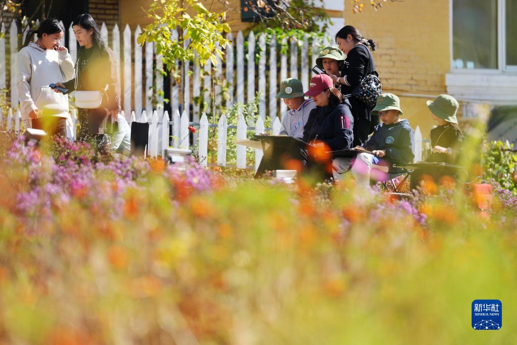 10月2日,学生在位于黑龙江省海林市的百年历史文化小镇——横道河子镇写生。