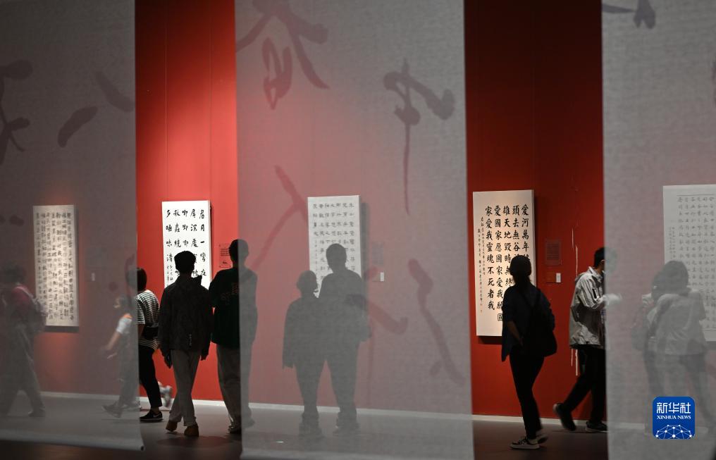 10月2日,参观者在天津美术馆观看《春游——李叔同歌词书法邀请展》。