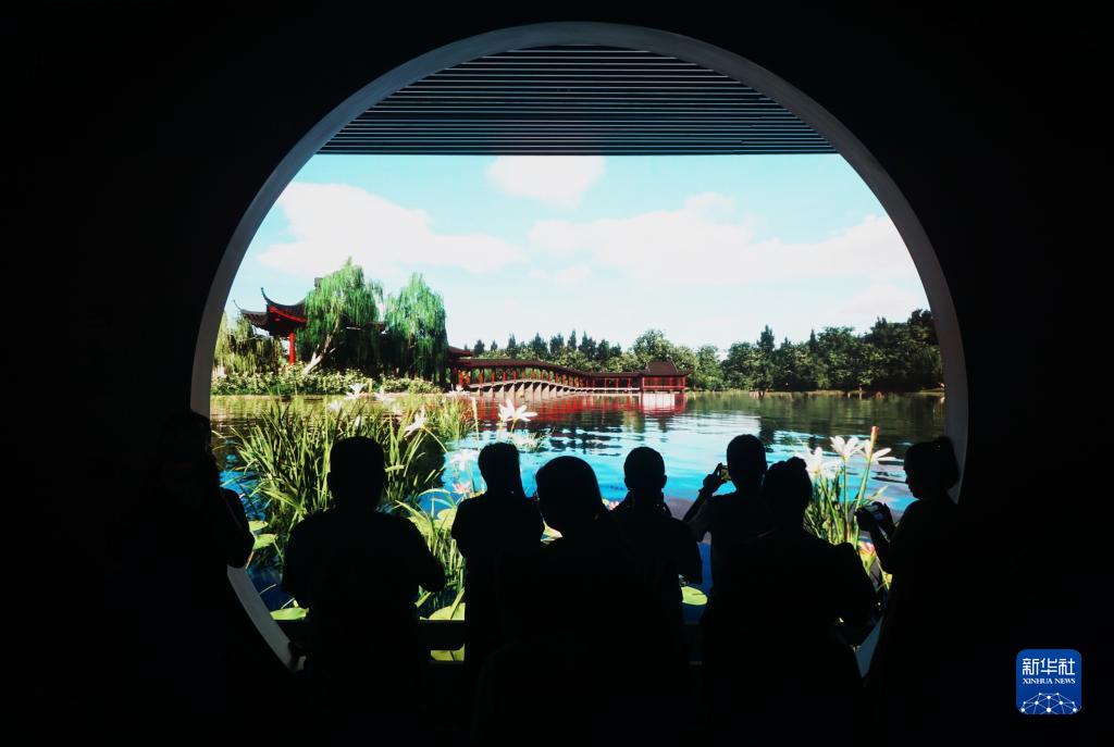 10月2日,参观者在杭州西湖博物馆观看通过数字技术展现的杭州西湖景观。