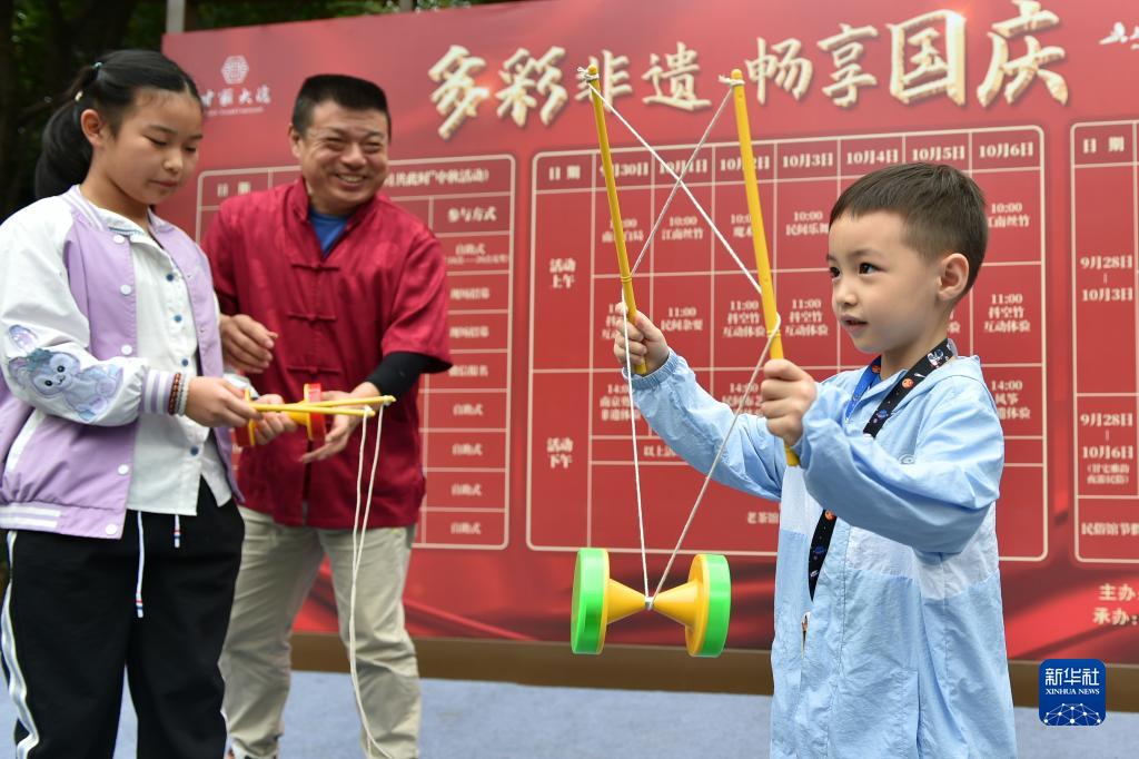 10月2日,小朋友在南京市民俗博物馆体验非遗项目抖空竹。