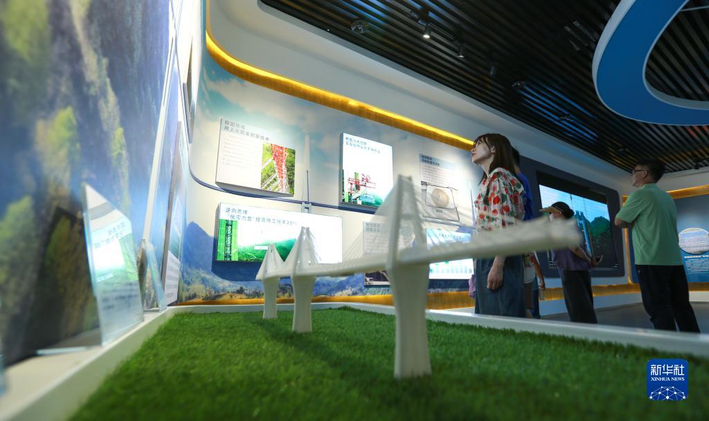 10月2日,游客在贵州省平塘县“天空之桥”观光服务区桥梁科普馆参观,了解平塘特大桥建设过程。