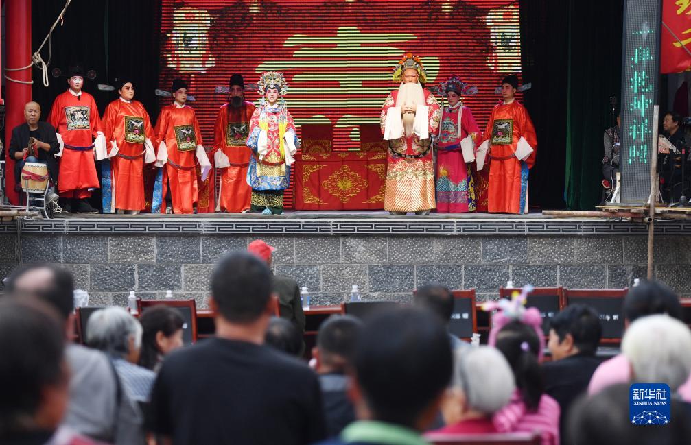 10月2日,当地群众在河北省石家庄市井陉县张家庄村观看井陉晋剧团表演的传统曲目《满床笏》。