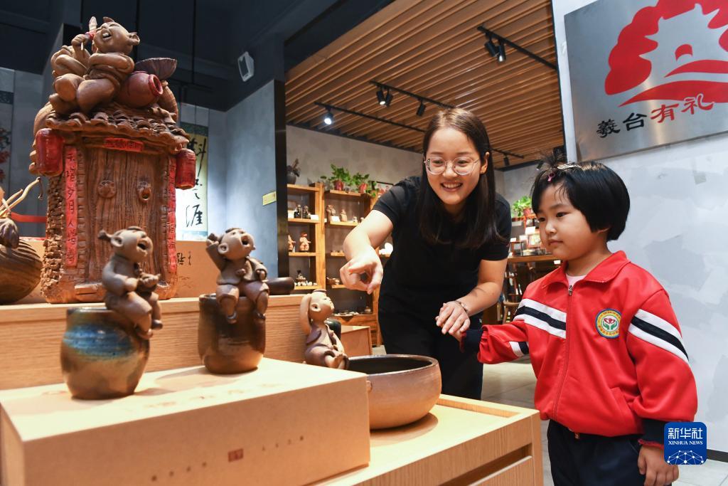 10月2日,市民在河北省石家庄新乐市文创客厅观看展出作品。