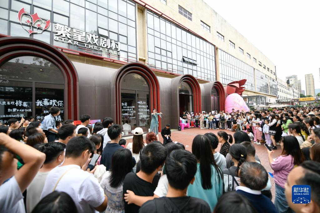 10月2日,成都繁星戏剧村演员在四川成都东郊记忆园区内为人们演出。