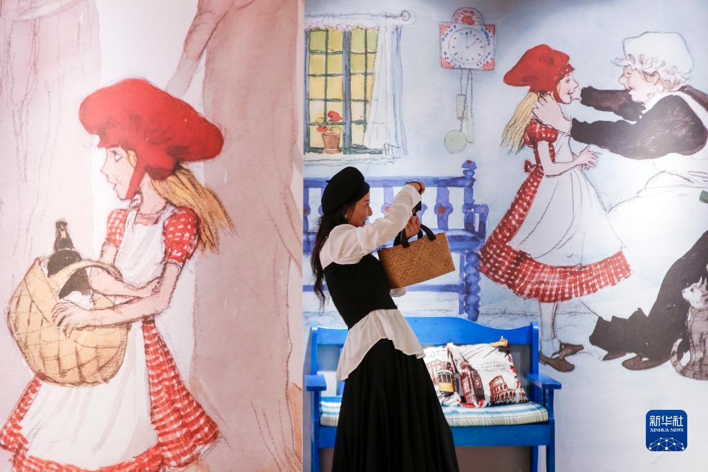 10月2日,一名女孩在安徽省黄山市屯溪区黎阳老街举行的《世界插画大展》上拍照。
