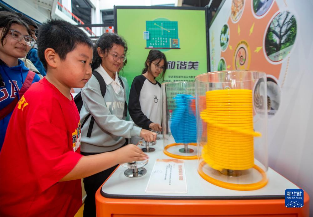 10月2日,小朋友在江苏泰州科技馆参观体验。