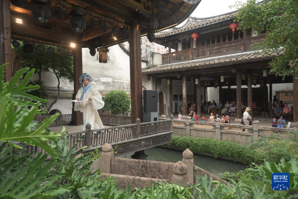 10月2日,人们在福州三坊七巷水榭戏台观看闽剧演出。