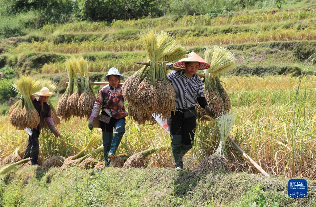 10月4日,村民在贵州省黔东南苗族侗族自治州从江县刚边壮族乡刚边村挑运糯稻。