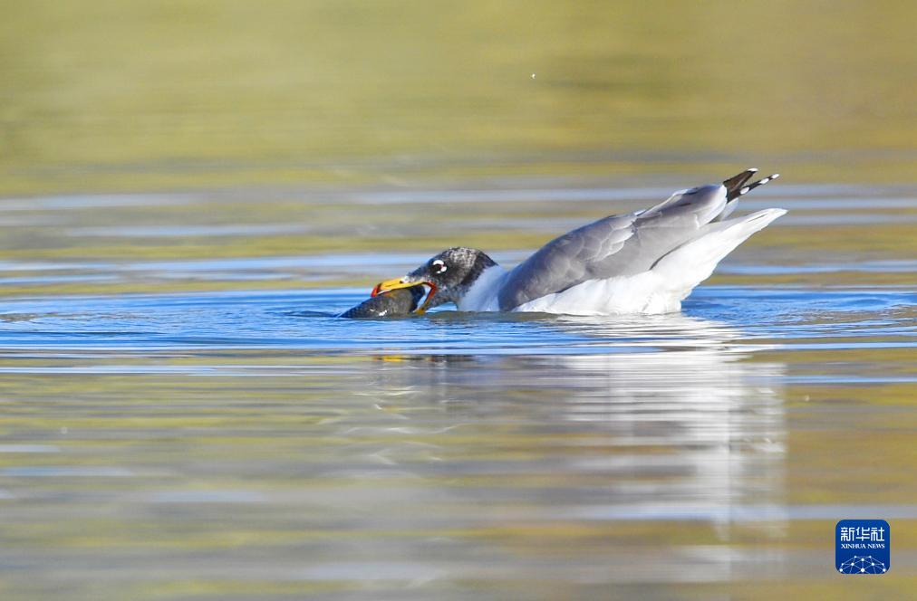 金秋十月,渔鸥在西藏拉萨市国家级自然保护区拉鲁湿地里嬉戏,惹人喜爱。