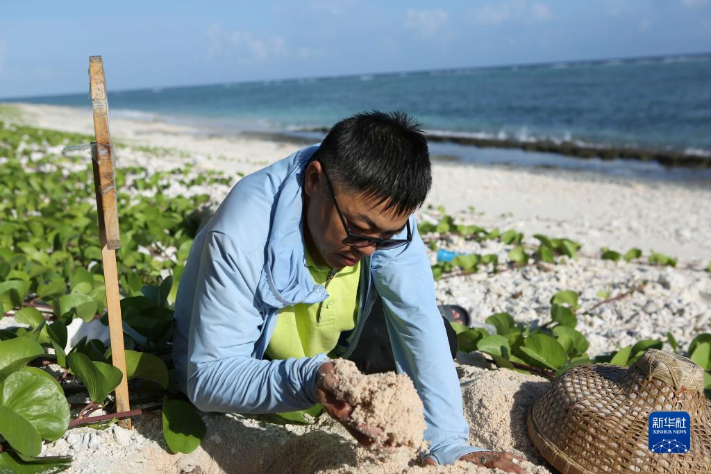 黄程是海南省三沙市七连屿管委会北岛社区居委会主任,也是北岛海龟的守护者。为了更好地守护海龟家园,他不仅要进行日常巡护、救助、登记等工作,还要定期清理海漂垃圾、种植固沙的羊角树等等。“岛礁生态好,海龟才会来产卵。”黄程说。