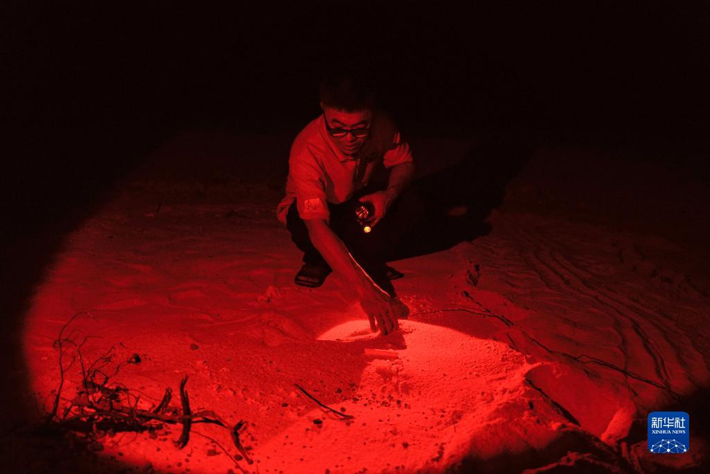 9月28日,黄程在夜晚观察到海龟上岸产卵,查看海龟足迹。