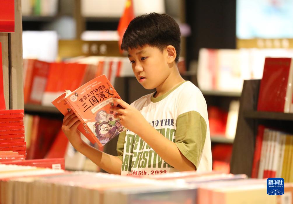 10月4日,一名小朋友在山东青岛西海岸新区新华书店读书。