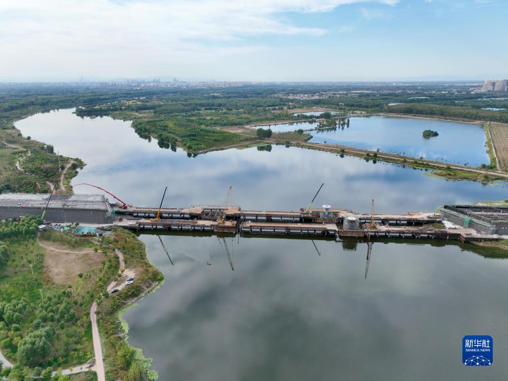 10月4日拍摄的厂通路潮白河大桥施工现场(无人机照片)。