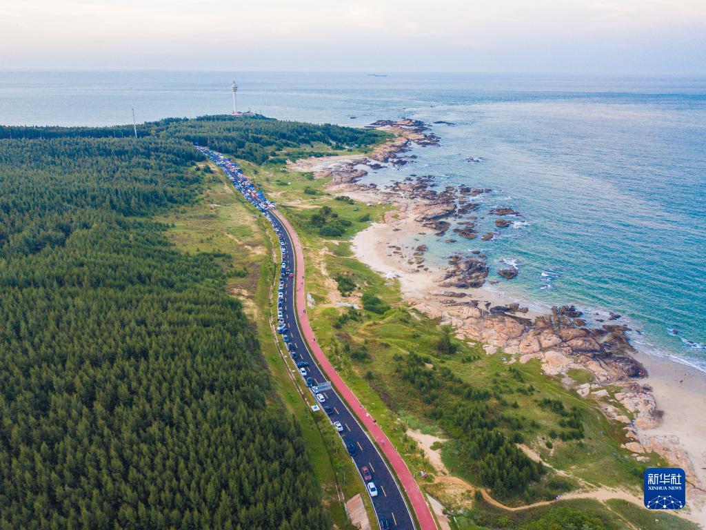 10月4日,海南环岛旅游公路文昌段风景如画,吸引了大批游客前来自驾游玩(无人机照片)。