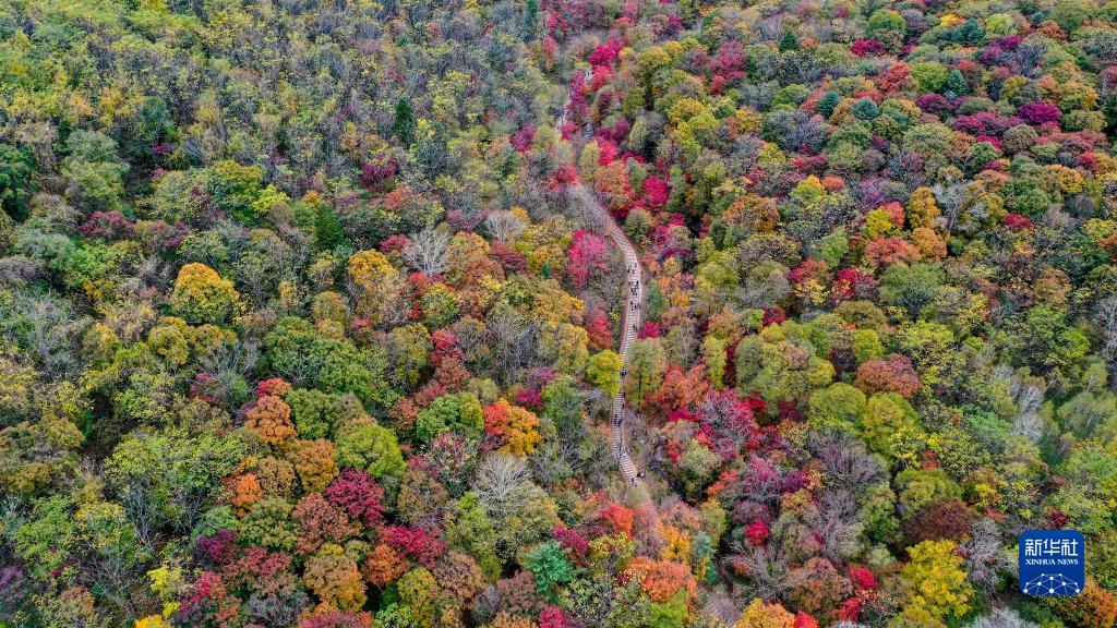 10月4日,游客在吉林省蛟河市红叶谷景区游览(无人机拍摄)。