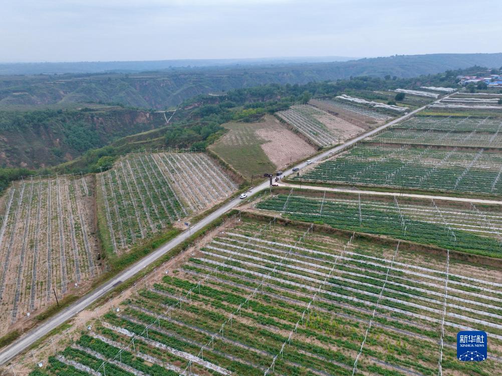 宜川县云岩镇北赤村完成新品种改造的苹果园(9月27日摄,无人机照片)。
