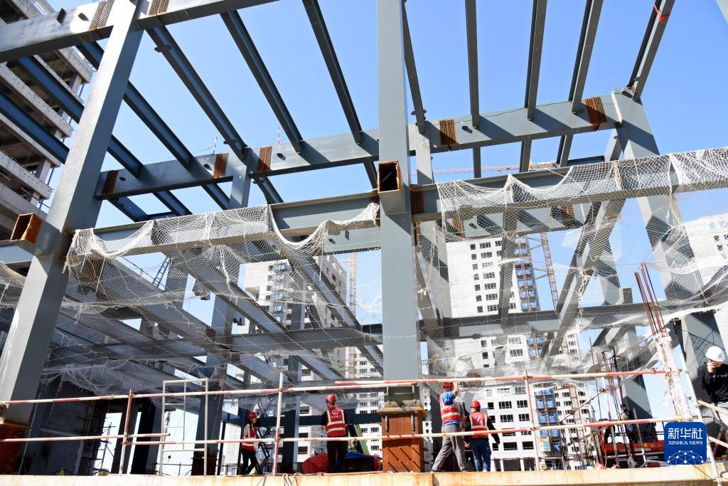 10月5日,中铁建工建设者在项目工地上进行钢结构安装。