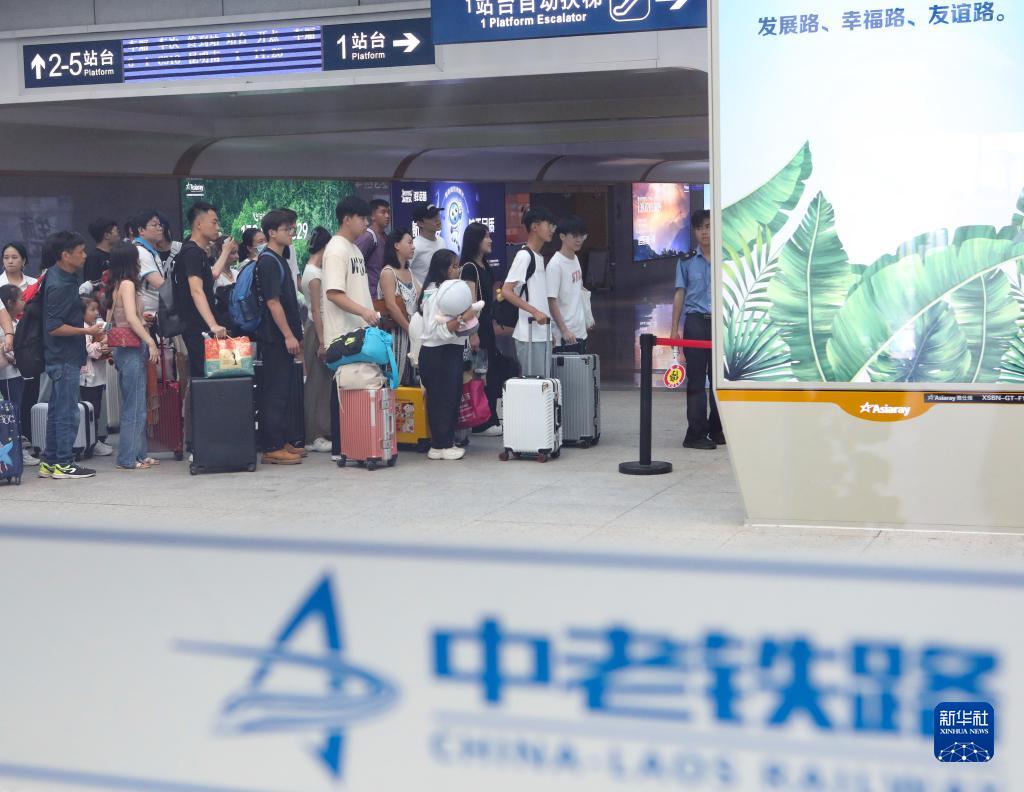 10月5日,在云南景洪市的中老铁路西双版纳站,旅客依次进入站台乘车。