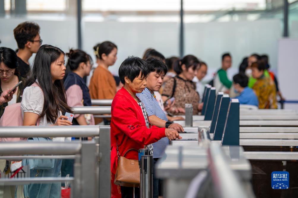 10月5日,铁路浙江金华站,旅客有序检票进站。