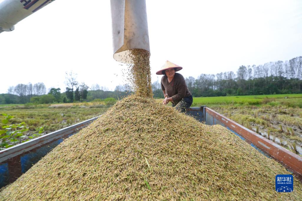 10月5日,在河南省信阳市光山县罗陈乡张楼村,一家合作社社员在抢收水稻。