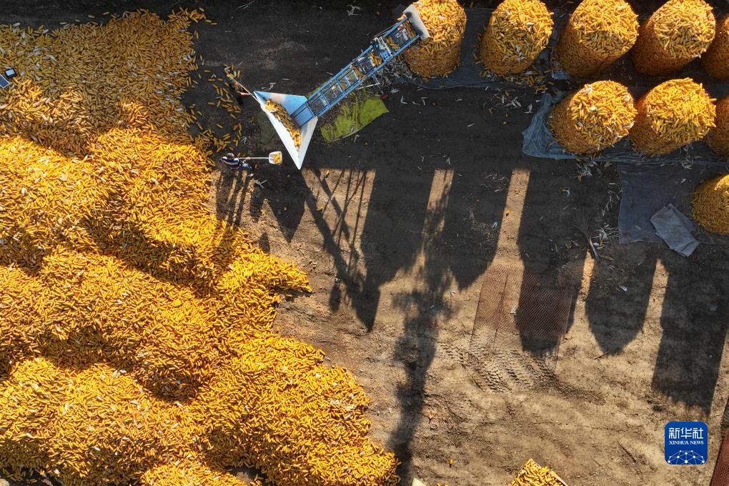 10月5日,在山东省聊城市茌平区胡屯镇北田村,村民将玉米装囤(无人机照片)。