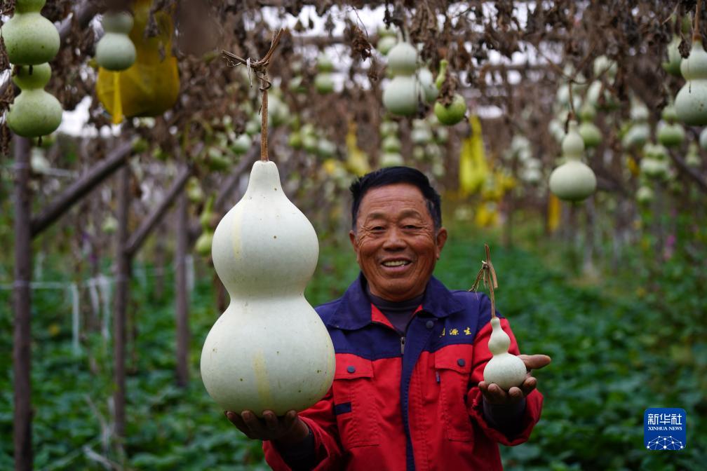 10月5日,河北省邢台市信都区会宁镇张尔庄村村民在展示收获的葫芦。