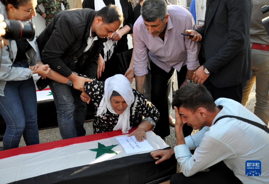 10月6日,无人机袭击遇难者家属在叙利亚霍姆斯参加亲人葬礼时哭泣。