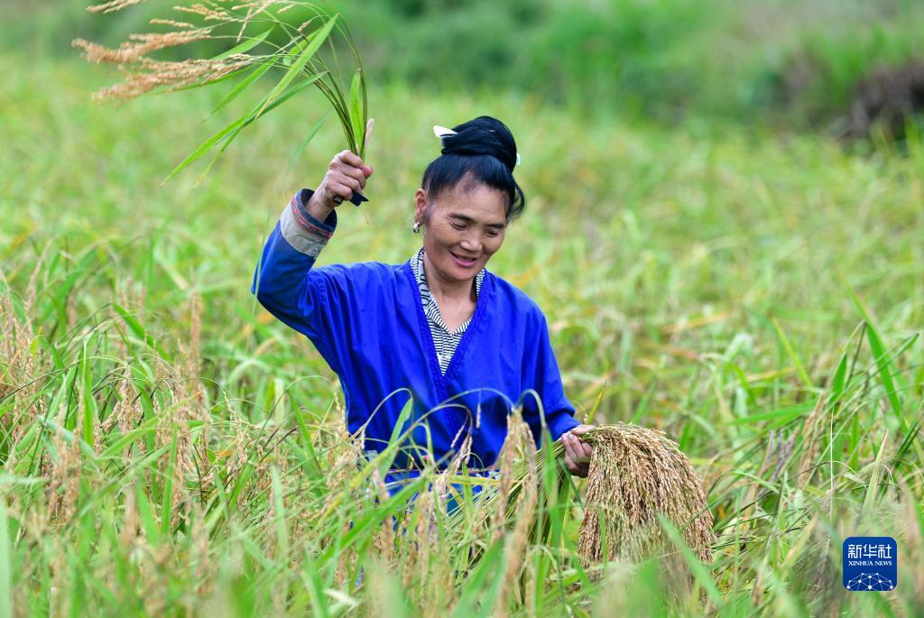 10月6日,农民在贵州省黎平县双江镇黄岗村收割稻谷。