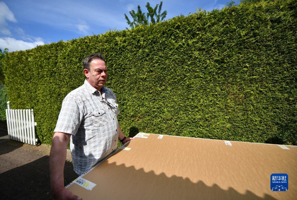 在德国施瓦岑贝克小镇,当地居民迪尔克搬运从经销商处订购的中国产太阳能设备(5月30日摄)。