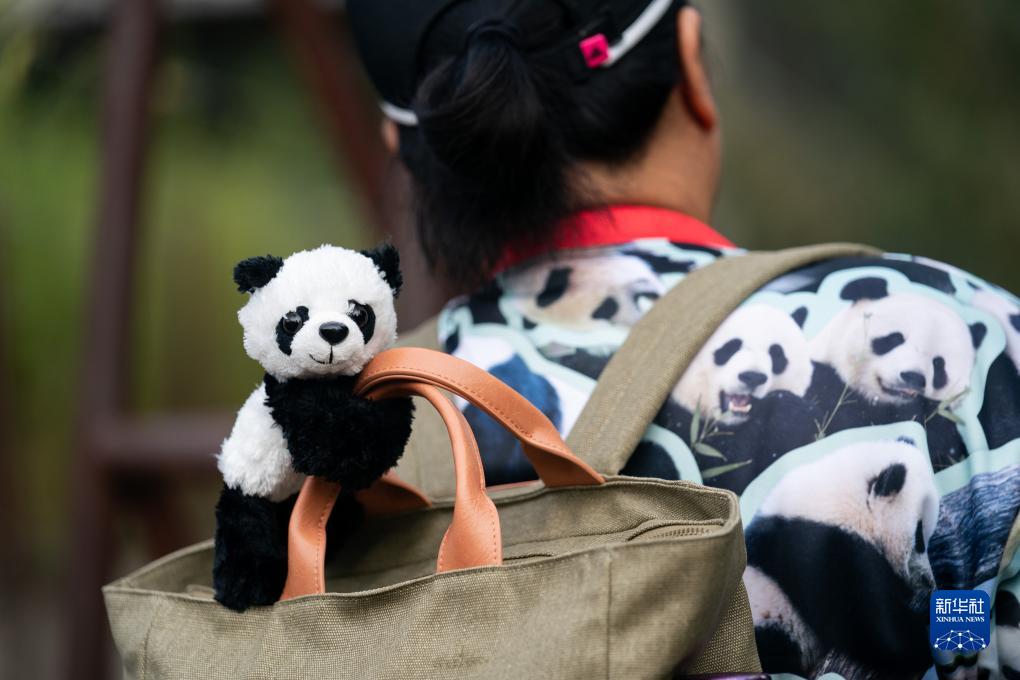 这是9月30日在美国华盛顿史密森学会国家动物园拍摄的游客背包上的大熊猫玩偶。