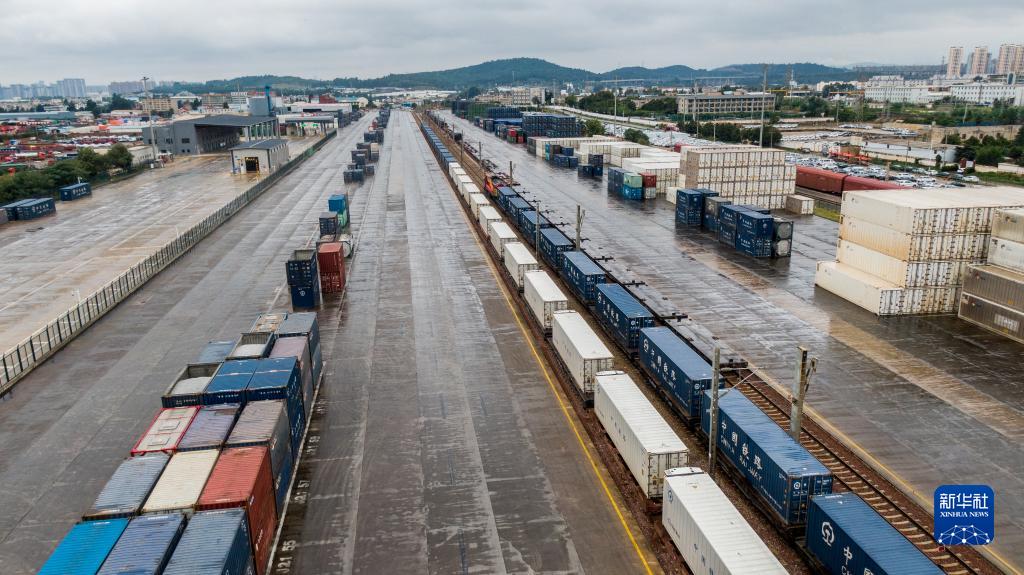 10月8日,“沪滇·澜湄线”国际货运班列驶出昆明市王家营西站(无人机照片)。