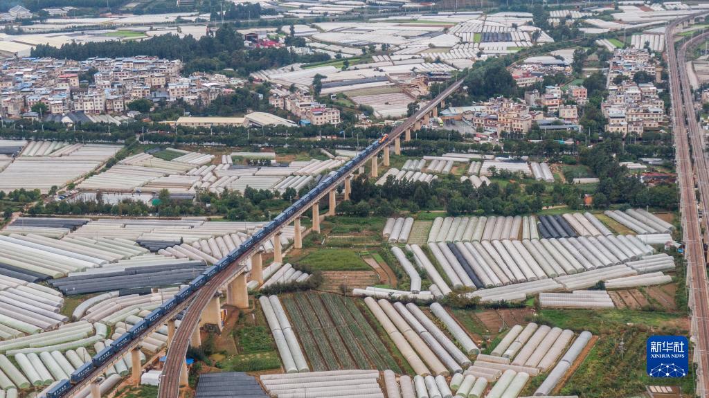 10月8日,“沪滇·澜湄线”国际货运班列驶出昆明市王家营西站(无人机照片)。