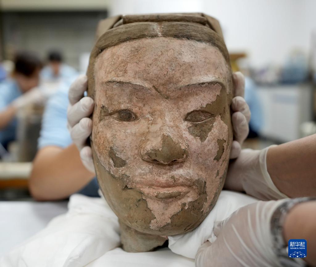 这是秦俑俑头彩绘还原修复后的样貌(8月23日摄)。