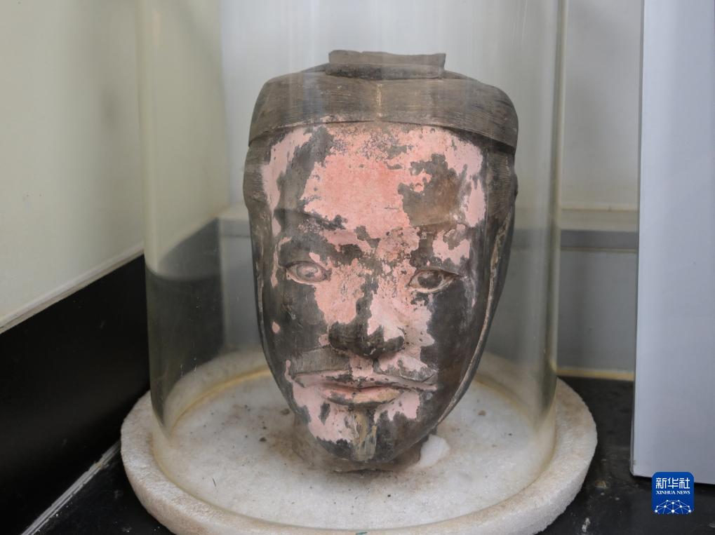 在秦始皇帝陵博物院文物保护部彩色陶俑修复室内,一尊彩色秦俑俑头被放在玻璃罩中保护(8月23日摄)。