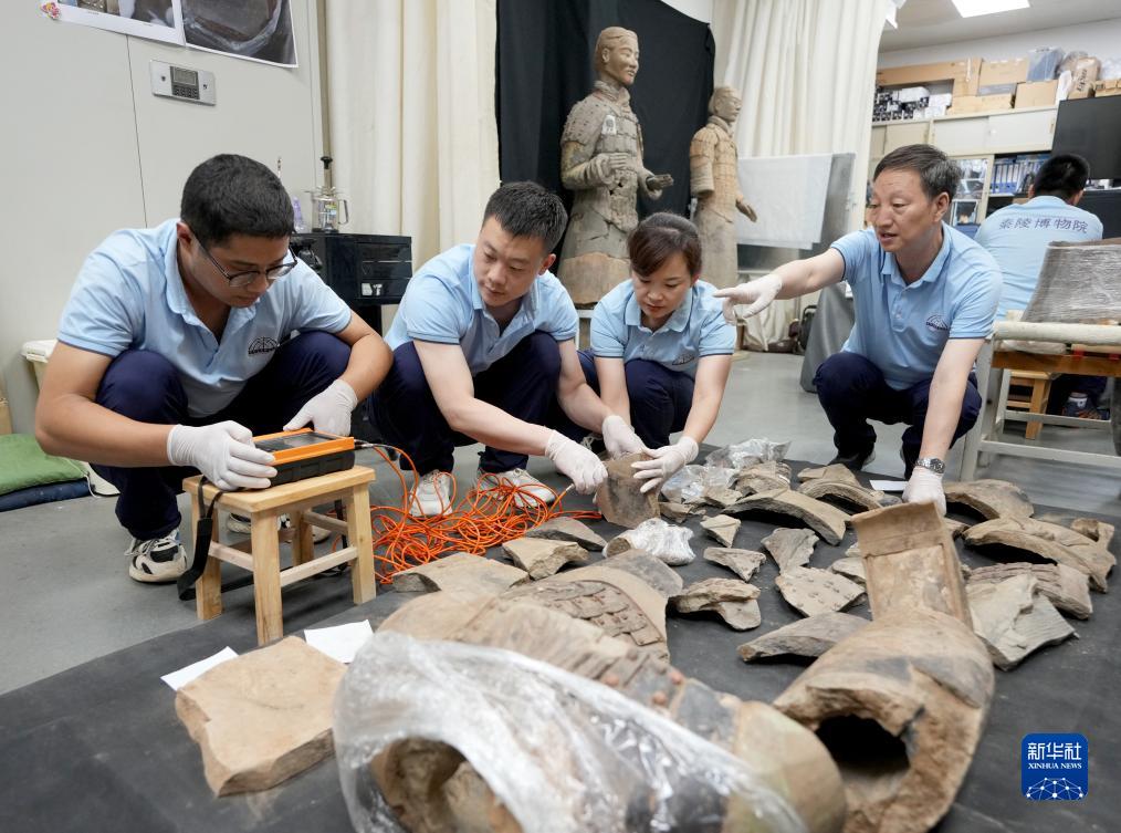 秦始皇帝陵博物院文物修复专家兰德省(右一)在指导技术人员运用超声波仪器测量秦俑胎体的密度(8月23日摄)。