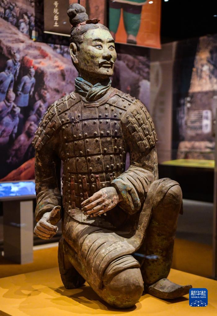 一尊出土的彩绘绿面跪射俑在首都博物馆展出(2021年5月18日摄)。