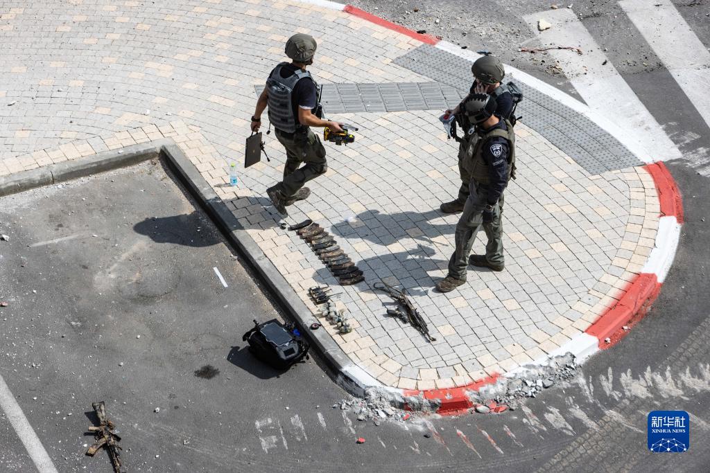 10月8日,在以色列南部城市斯代罗特,从哈马斯武装人员手中缴获的武器和装备被摆放在地上。