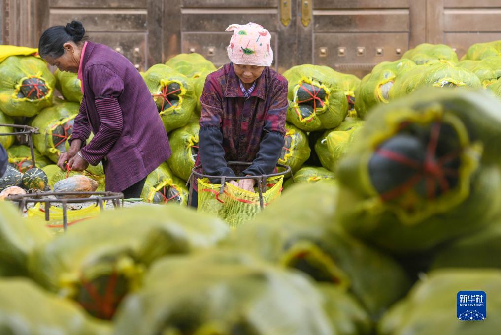 10月8日,在湖南省永州市道县四马桥镇昌瑞瑶寨蔬菜种植基地,村民将收获的南瓜打包。