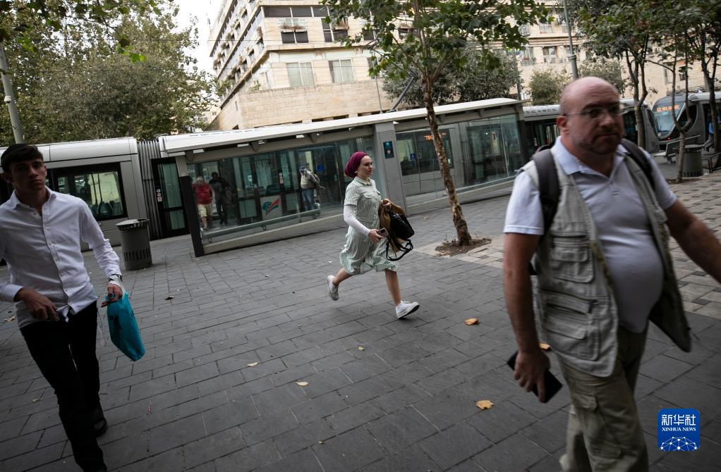 10月9日,在耶路撒冷街头,人们在防空警报响起时冲向避难设施。