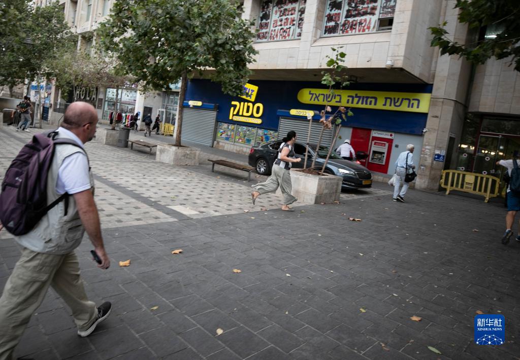 10月9日,在耶路撒冷街头,人们在防空警报响起时冲向避难设施。