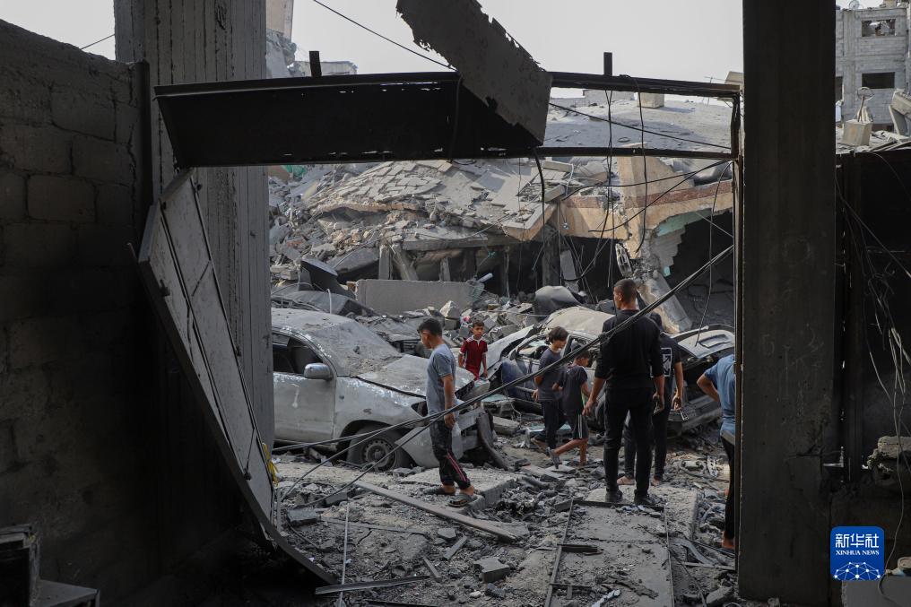 10月9日,在加沙城,人们查看被以色列空袭炸毁的建筑废墟。