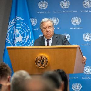 10月9日,在位于纽约的联合国总部,联合国秘书长古特雷斯在记者会上就巴以局势发表谈话。