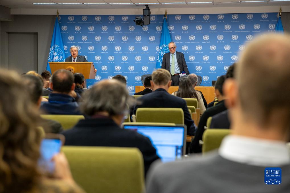 10月9日,在位于纽约的联合国总部,联合国秘书长古特雷斯(后左)在记者会上就巴以局势发表谈话。
