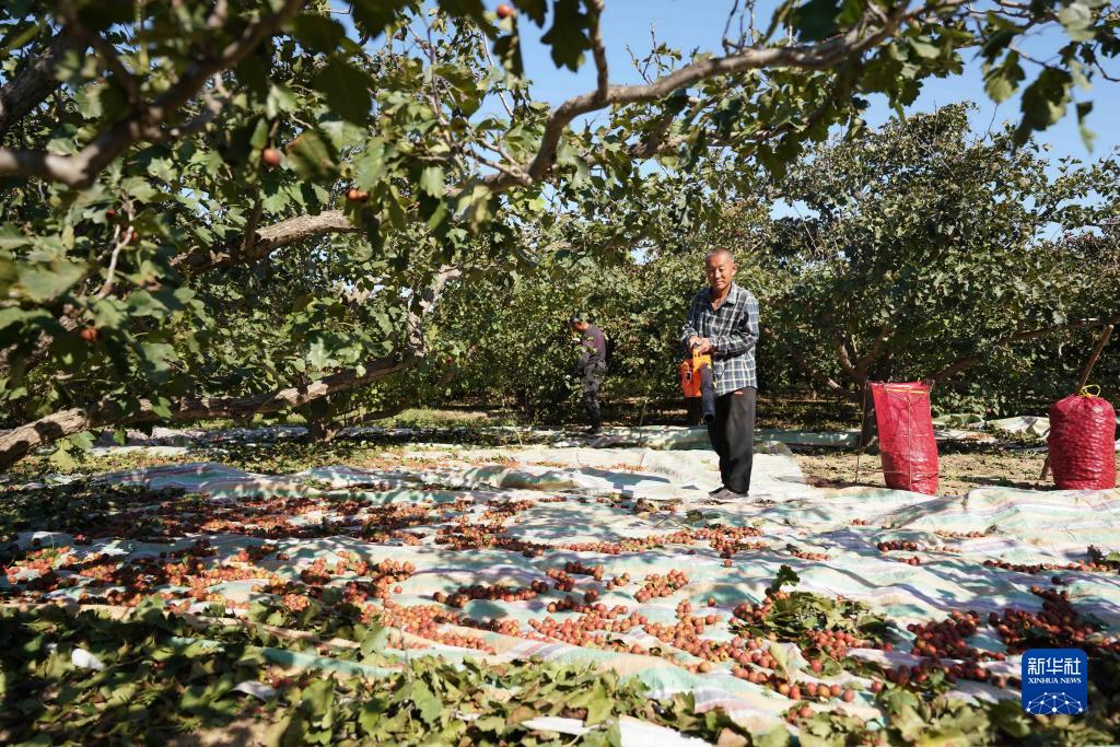 10月9日,河北省清河县花园村村民在山楂林里劳作。