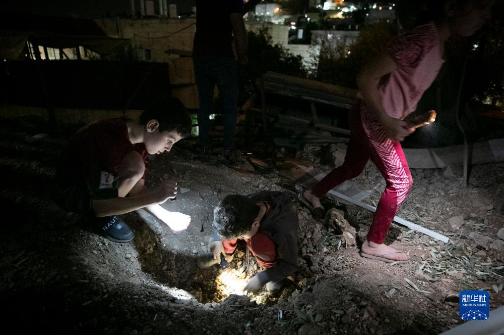 10月9日,在耶路撒冷以西的阿布高什村,几名儿童在火箭弹弹坑旁查看。