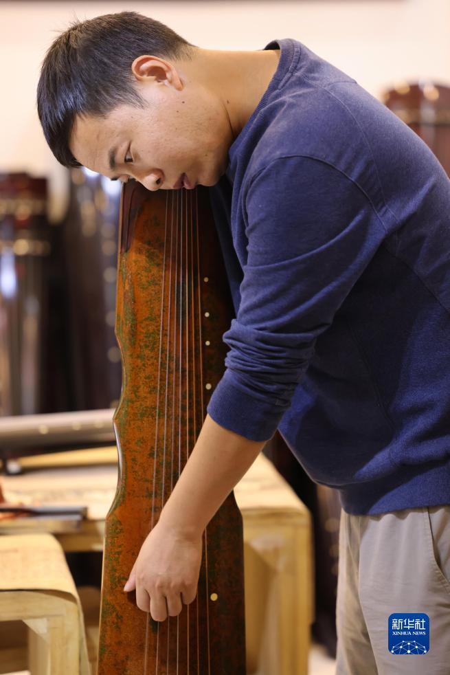 10月9日,河南省兰考县堌阳镇徐场村的斫琴师徐亚冲为古琴调音。