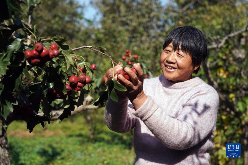 10月10日,村民在北京市平谷区熊儿寨乡魏家湾村的一处红果种植园采摘红果。