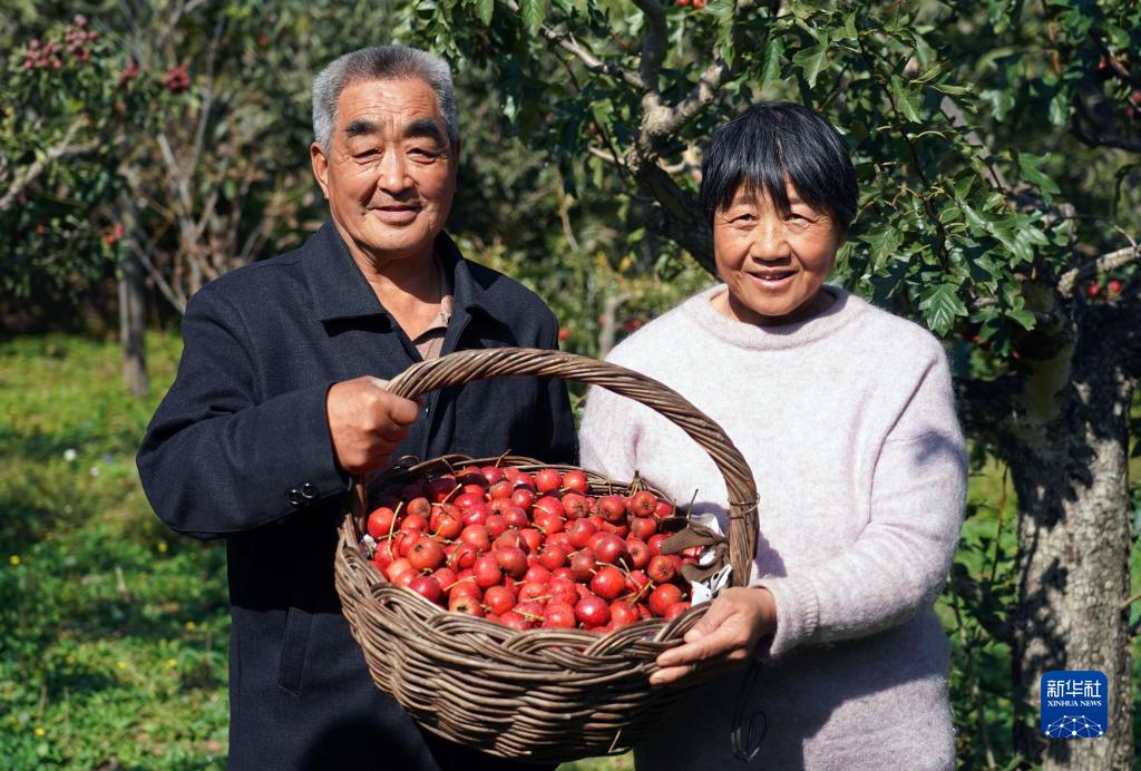 10月10日,在北京市平谷区熊儿寨乡魏家湾村的一处红果种植园,村民展示采摘的红果。