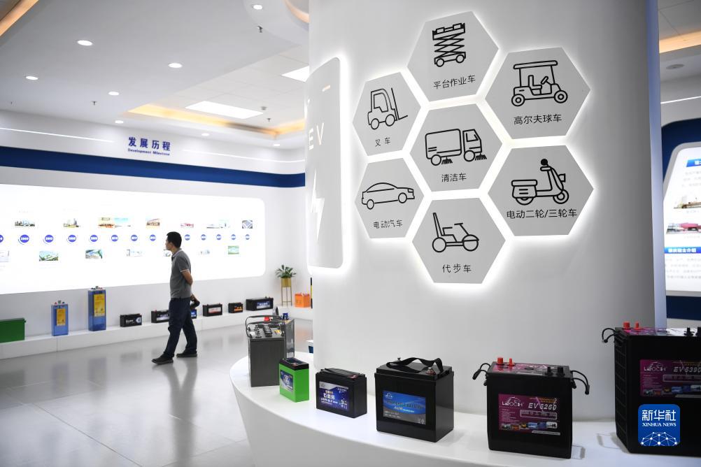 10月9日,参观者在广东肇庆理士电源技术有限公司观看各种类型的电池产品。